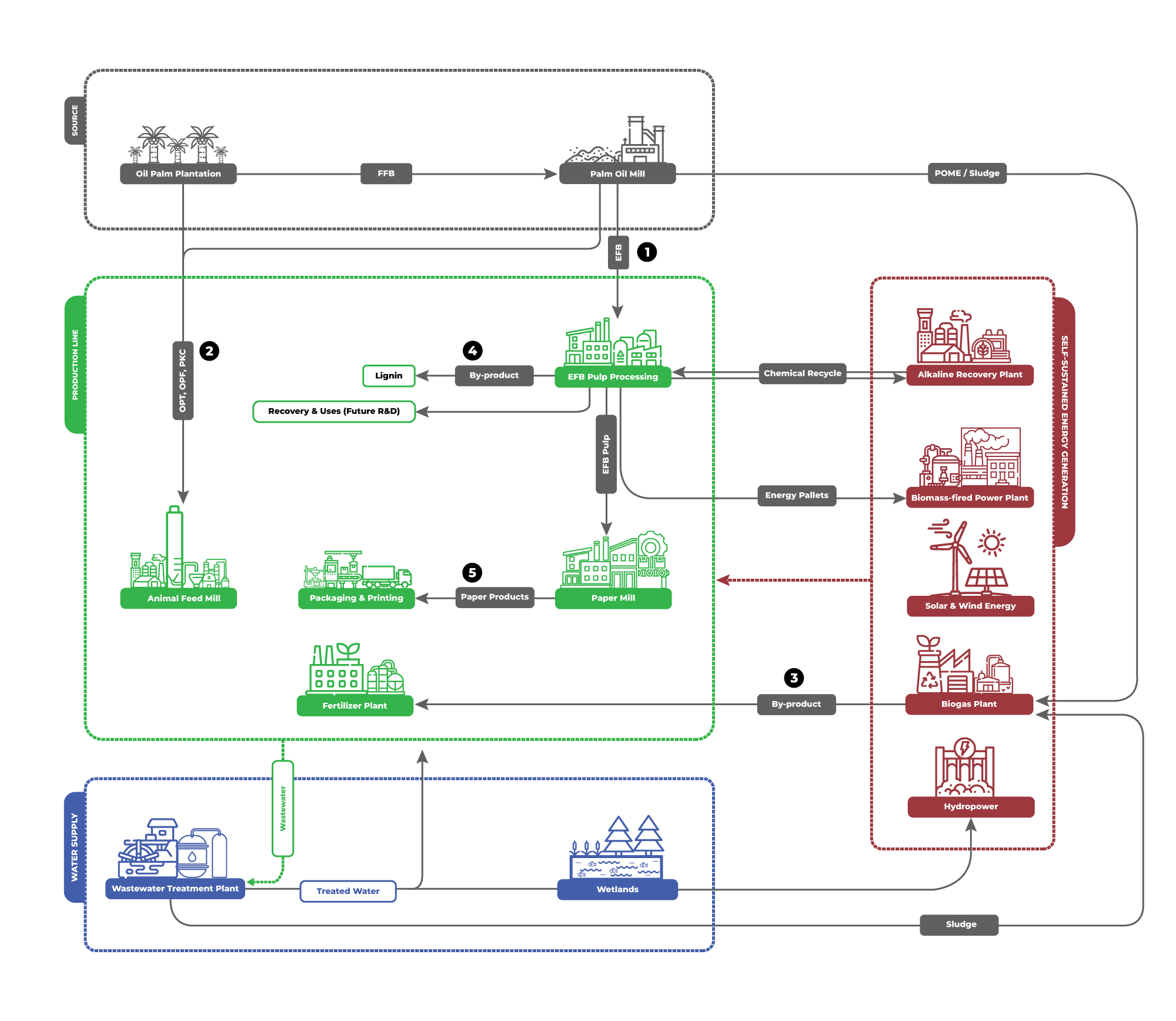 The core of GTP are the pulp and paper mills. We utilise our exclusively owned patented PRC-RBMP technology to take full advantage of Empty Fruit Bunches (EFB) – an abundantly available raw material source produced by the local palm oil industry. The PRC-RBMP method sets a solid foundation in GTP for the innovation of oil palm biomass, which is also converted into animal feed, fertiliser, lignin, and pharmaceutical products.