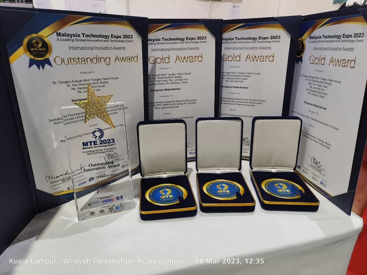 Nextgreen Global successfully participated in the local technology innovation competition at the Malaysia Technology Expo (MTE 2023). Competing in two categories, we proudly secured 3 Gold medals and 1 Outstanding Innovation Award. In the Manufacturing Process and Advanced Materials category, we won the Gold and Outstanding Innovation awards for our Sustainable Food Packaging made from oil palm empty fruit bunches’ cellulosic fibre. This innovative packaging solution was developed using a hybrid chemical-mechanical-thermal process. Additionally, our patented technology, the Preconditioning Refiner Chemical-Recycle Bleached Mechanised Pulp (PRC-RBMP), earned us the second Gold award in the oil palm fibre-pulp production category. Furthermore, we were honored with the third Gold award for establishing the Green Technology Park. This recognition highlights our intensive research efforts in environmental protection, energy conservation, water management, wastewater treatment, sanitation, and green technology. These achievements inspire Nextgreen Global to continue advancing our research to remain competitive and aligned with the forefront of sustainability and industrial advancements.